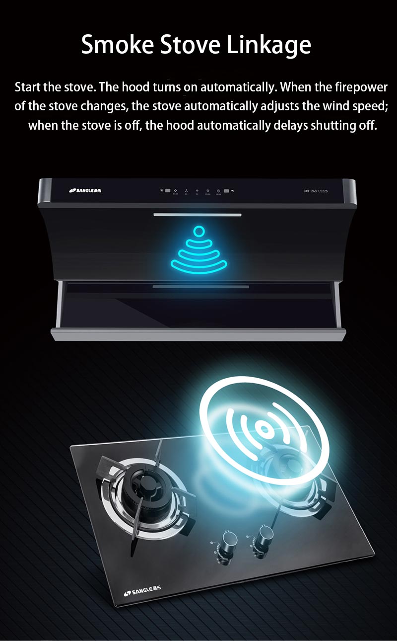 Start the stove and the hood will automatically turn on. When the firepower of the stove changes, the hood automatically adjusts the wind speed; when the stove is turned off, the hood automatically delays shutdown. (Sangle stove 266L/268L, can be combined with one of the stoves to install, realize the function of the smoke stove linkage and the wind follow the fire)